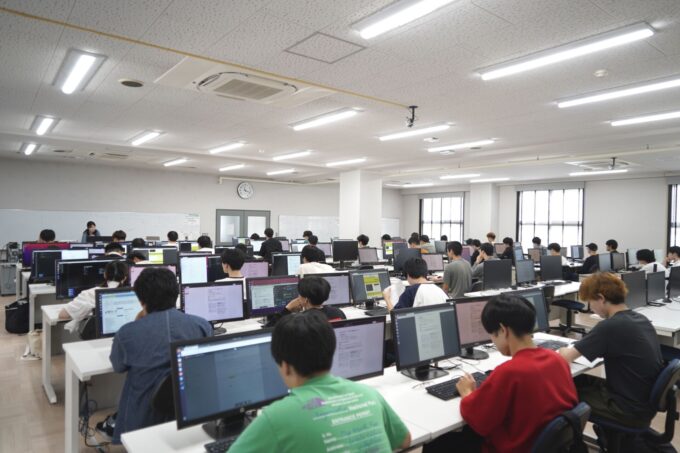 学内で唯一,学科専用のコンピュータ実習室を保有し,プログラミング等の講義・演習に適した環境が構築されています.特に学科の学生は,授業時間外も自由に実習室環境を利用できます. さらに,約30台の高性能PCを備えた情報工学実験室を有し,集積回路設計や3Dグラフィック等のより専門的な開発を行うことができます.