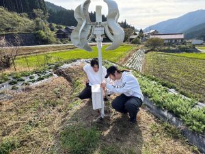 その後、大茅地区の方たちから手作りのお弁当をいただき、研究のために現地に設置している風力発電システムの調整を行いました。
